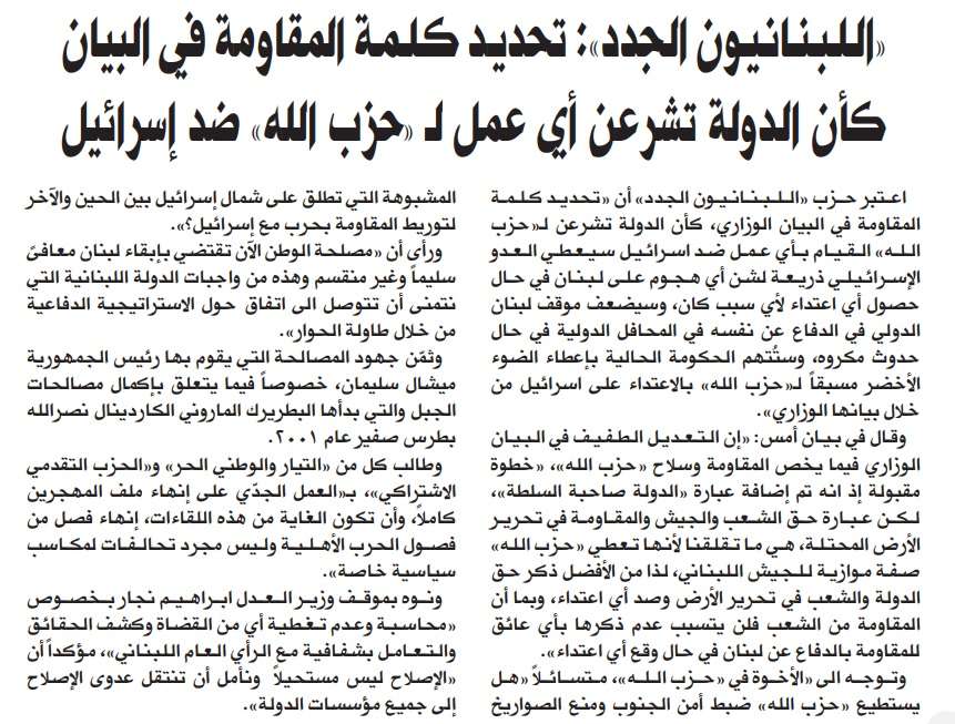 اللبنانيون الجدد: تحديد كلمة المقاومة في البيان كأن الدولة تشرعن أعمل لحزب الله ضد إسرائيل